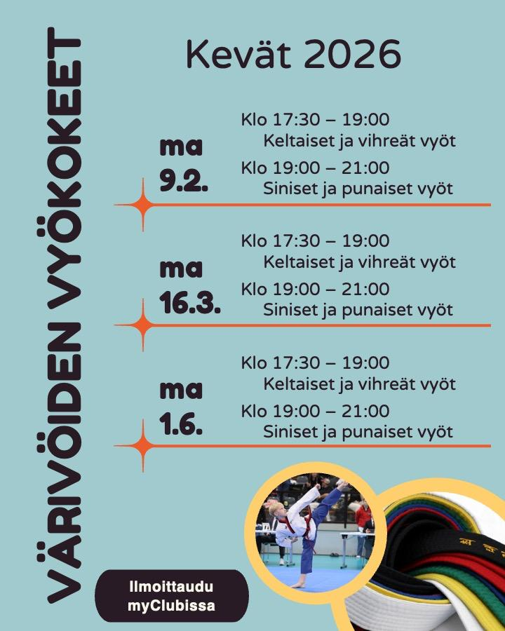 - 8. kup (keltainen) 50€ sis. vyökoe, vyö ja taekwondopassi