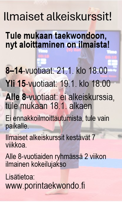 Porin taekwondo järjestää jälleen ilmaiset alkeiskurssit. Taekwondo on lajisi jos sinua kiinnostaa monipuolinen harjoittelu.